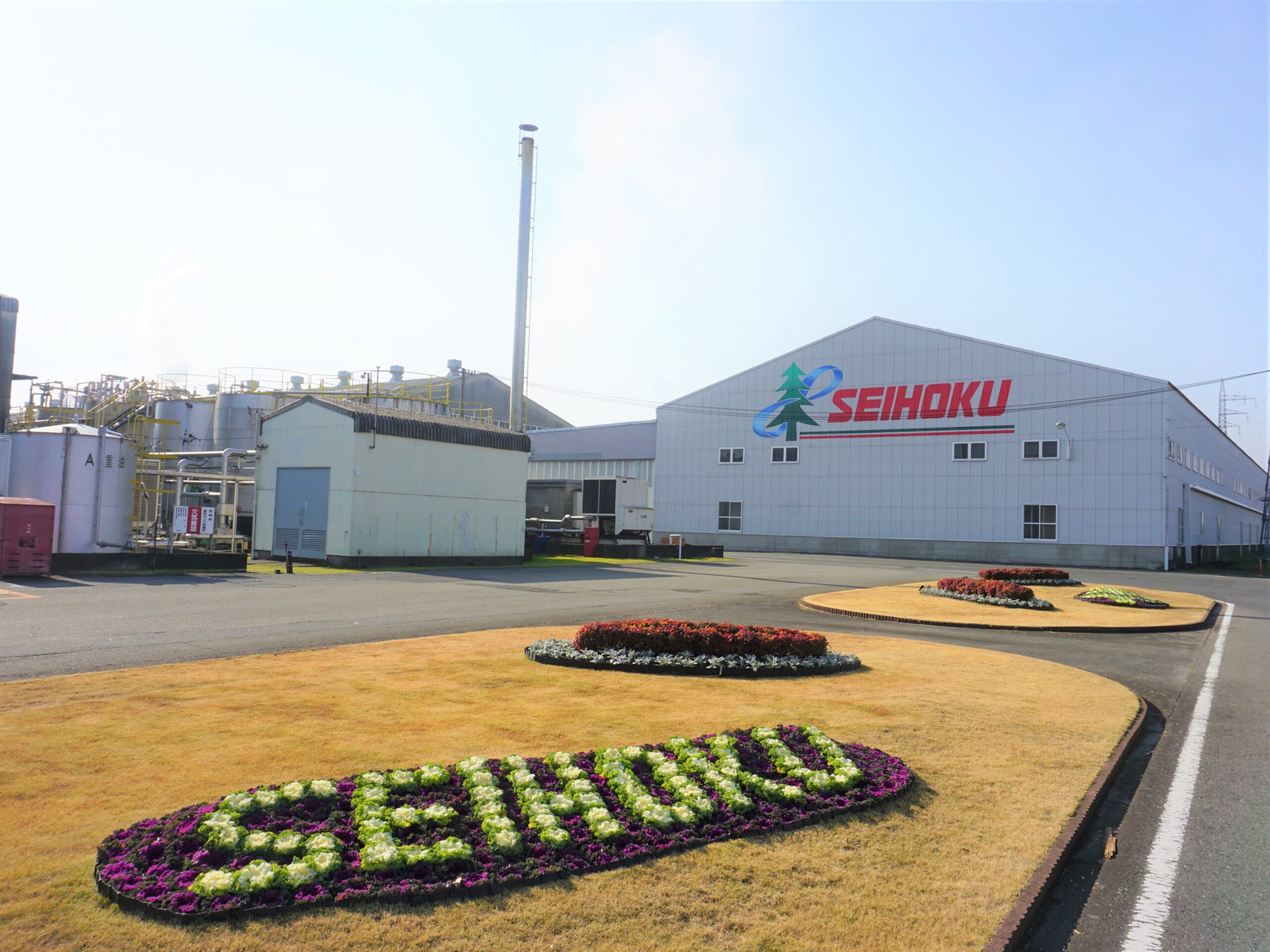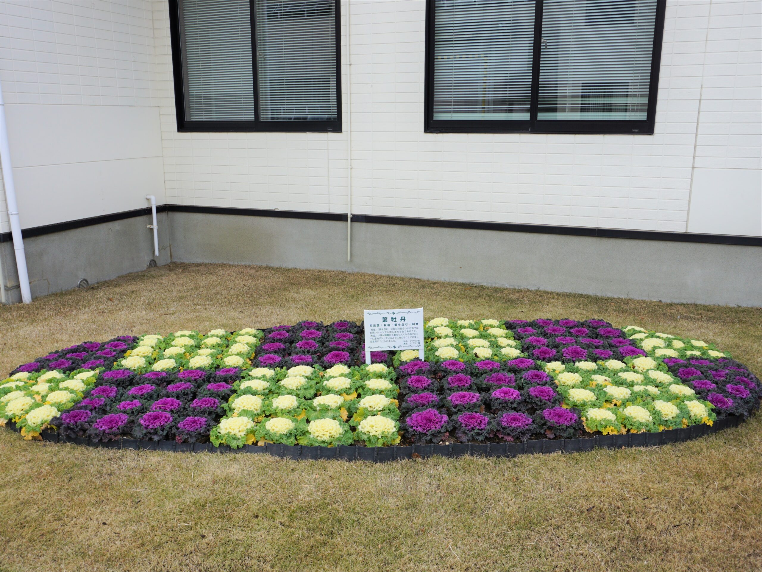 してくれる葉牡丹を植栽しました。工場入口には当社の社名「SEIHOKU」を描く文字植え(写真左)を総合事務所前には交互に色を配置して整然とした印象を与える市松植え(写真右)で整備しました。当社は、今後とも工場全体の清潔感を保ちながら自然と調和した緑化施設を整え、ご来社されたお客様や従業員が心地よく過ごせる空間を提供して参りたいと考えています。